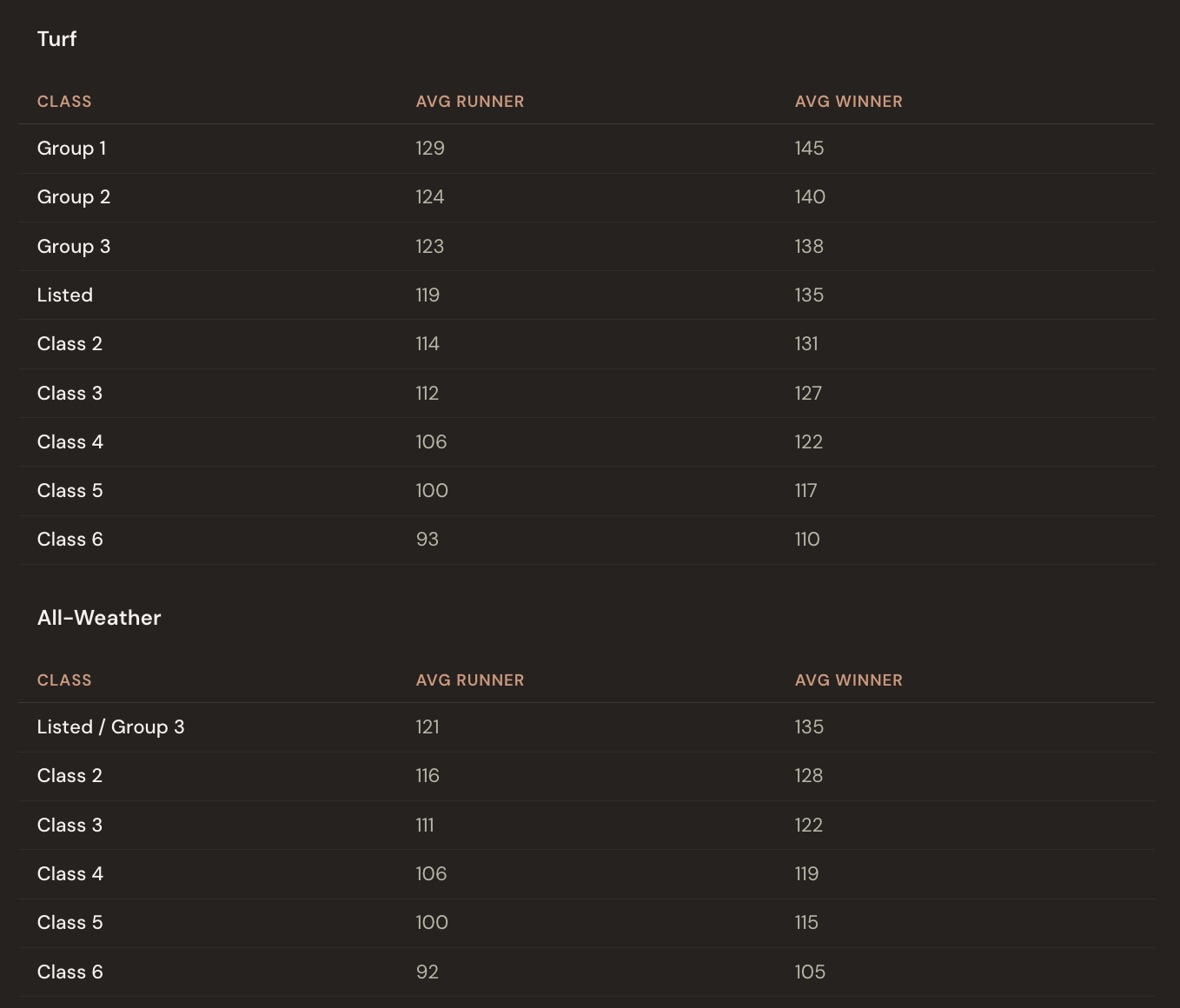 Turf and dirt are completely separate. This is a deliberate choice I've made — to treat turf form and dirt form as entirely different things. A turf rating can never influence a dirt rating, and vice versa. They are essentially different sports. For practical purposes, I've also chosen to group all dirt tracks and different all-weather tracks under one umbrella. I know these surfaces have their own nuances. But the data supports the grouping, and it keeps things clean.