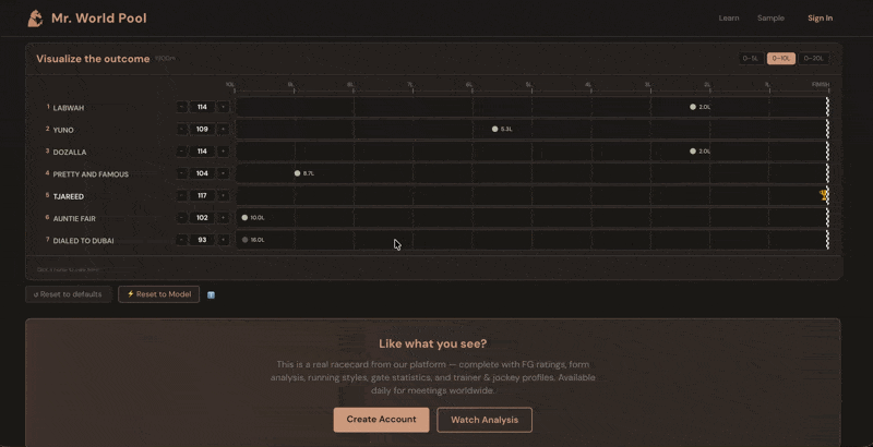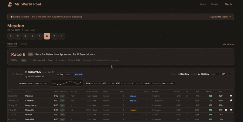The rating system has been developed over 20 years across more than 11 countries and more than one million race results. It is the foundation of everything on Mr. World Pool — explore the full product at mrworldpool.com.